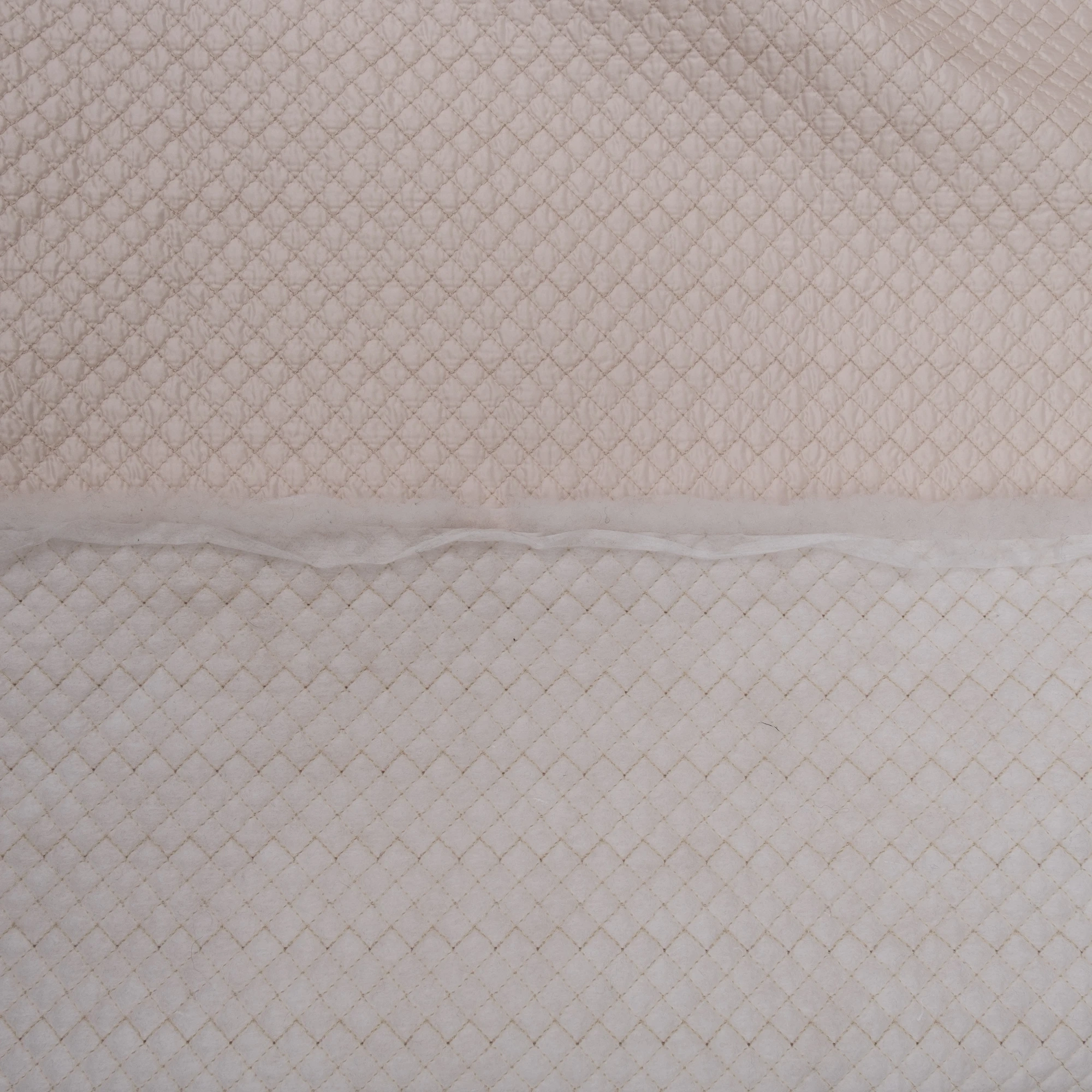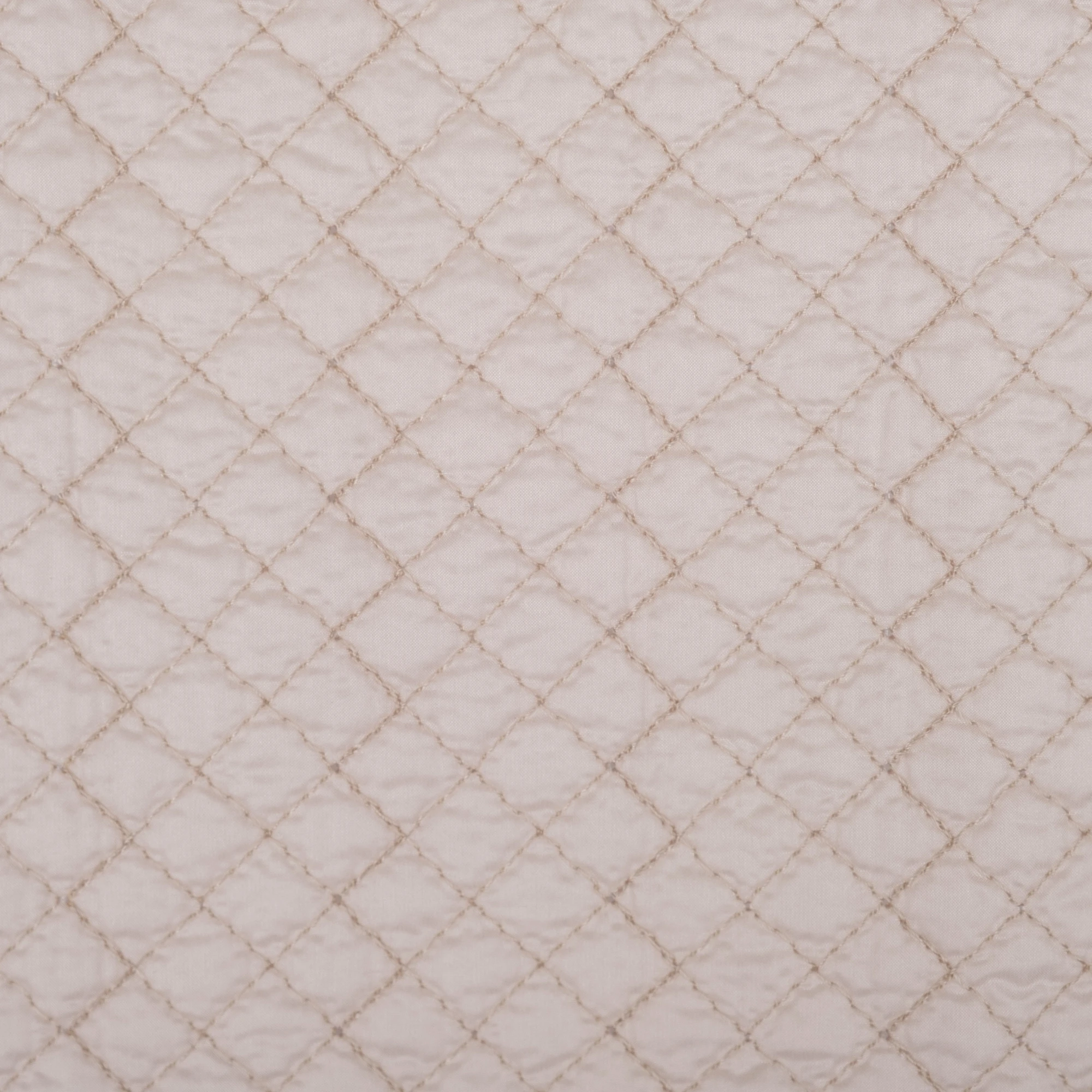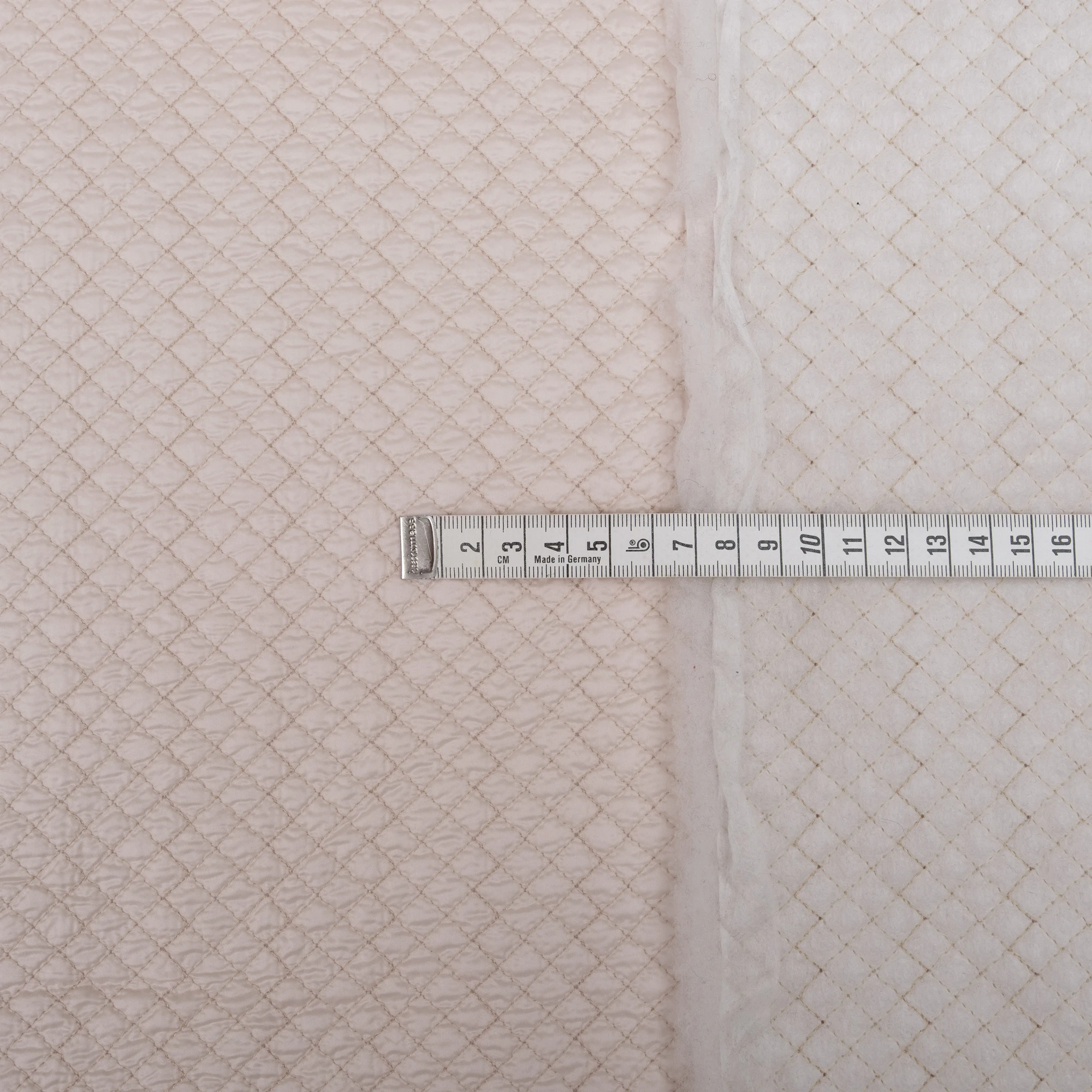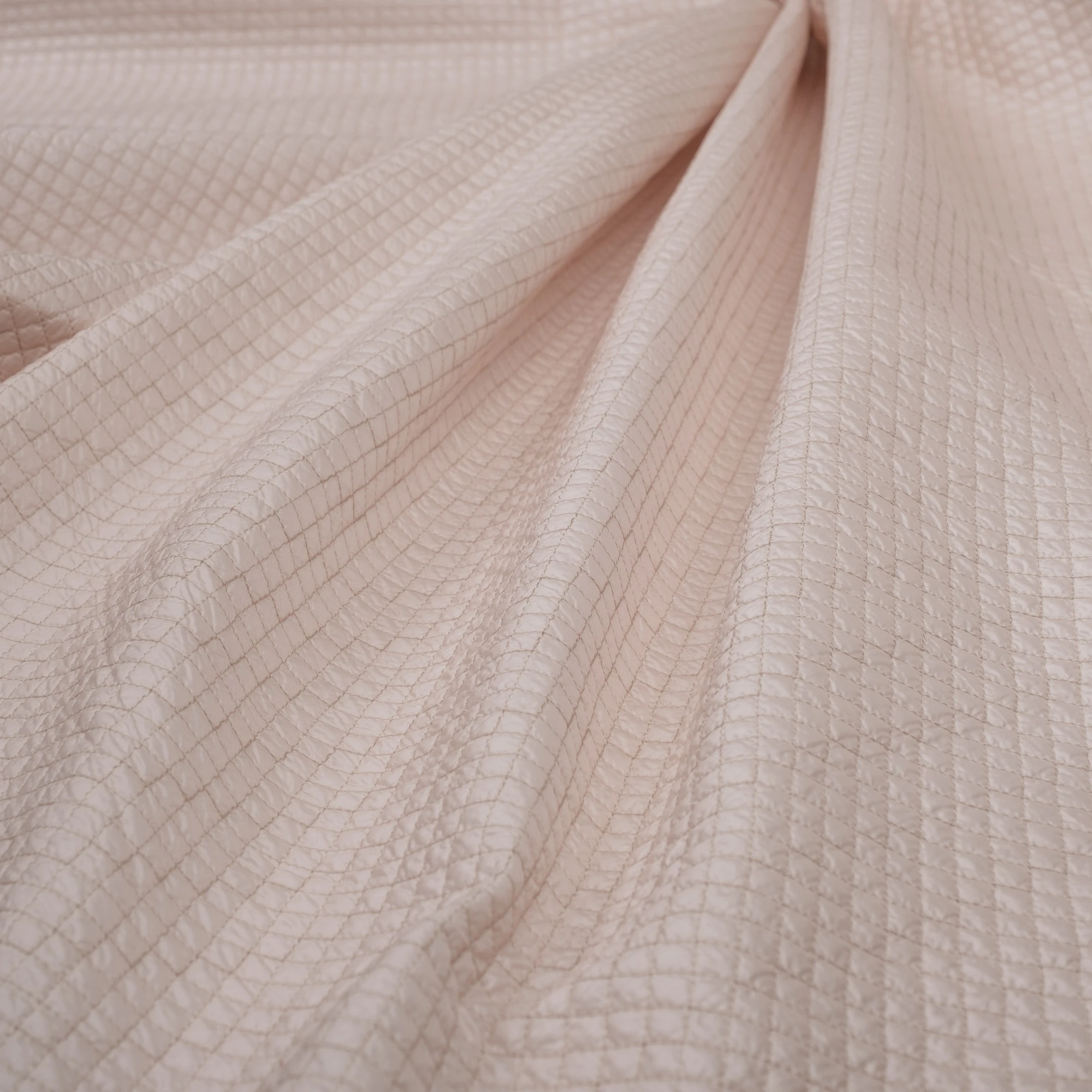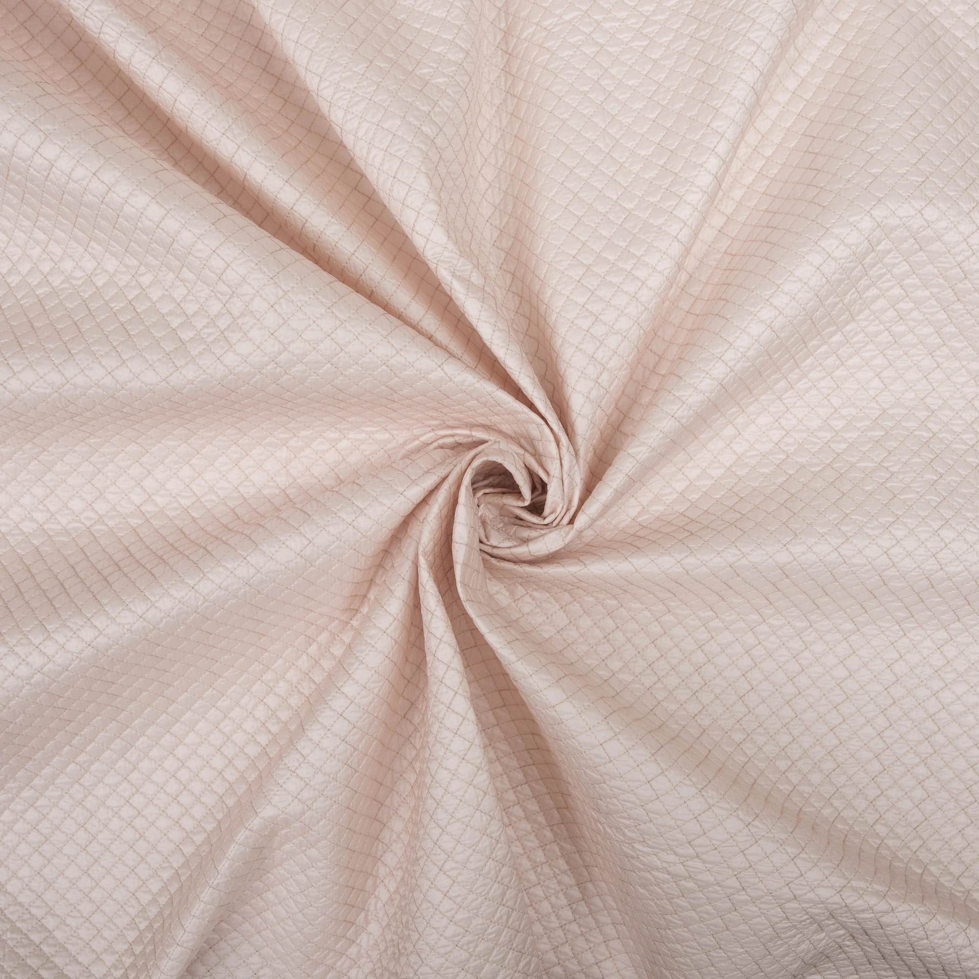 Włoska tkanina pikowana o delikatnej, jasnej kolorystyce i regularnym wzorze rombów, stworzona z myślą o nowoczesnych kurtkach i lekkiej odzieży wierzchniej. Powierzchnia materiału jest miękka i przyjemna w dotyku, a jednocześnie estetyczna i uporządkowana dzięki starannemu pikowaniu.