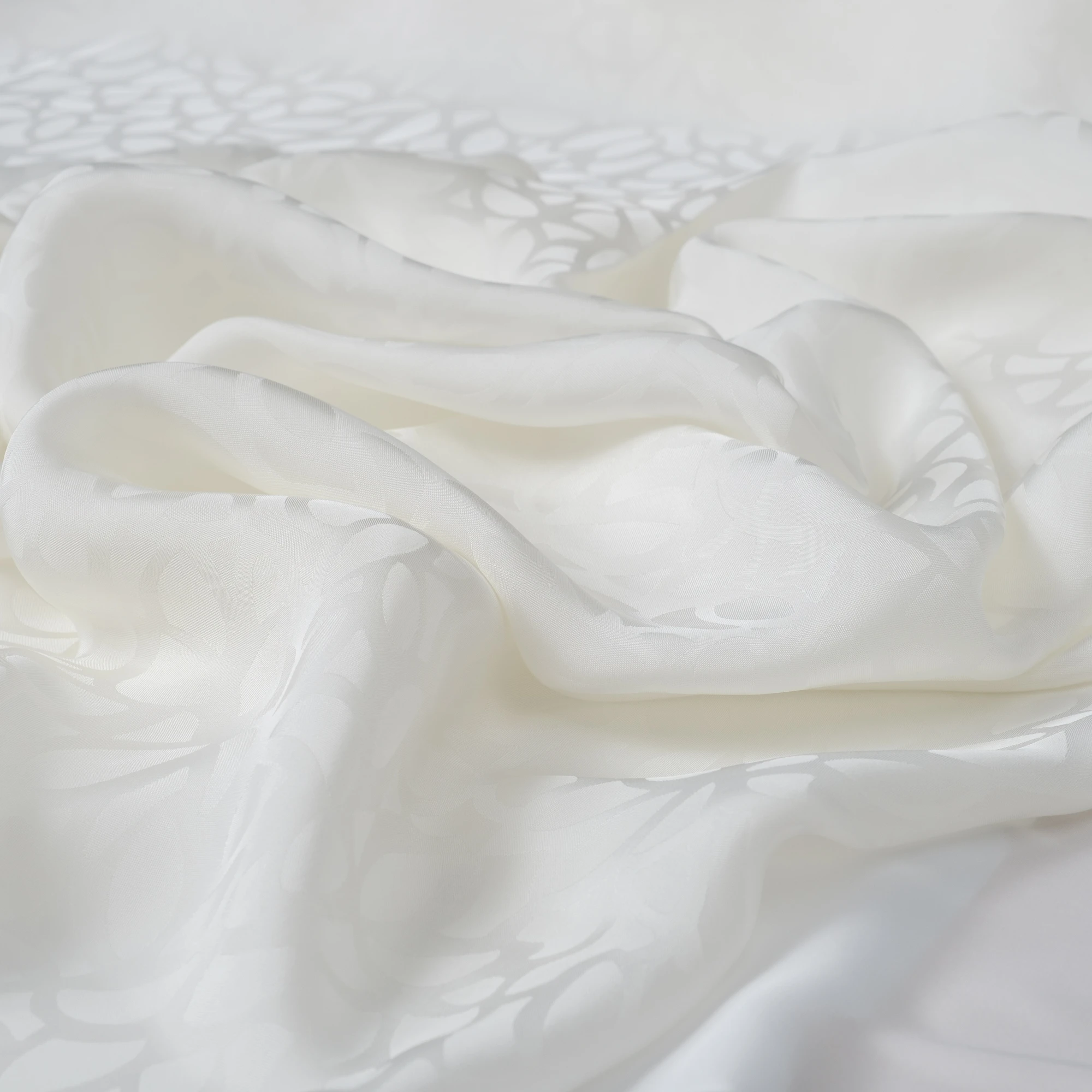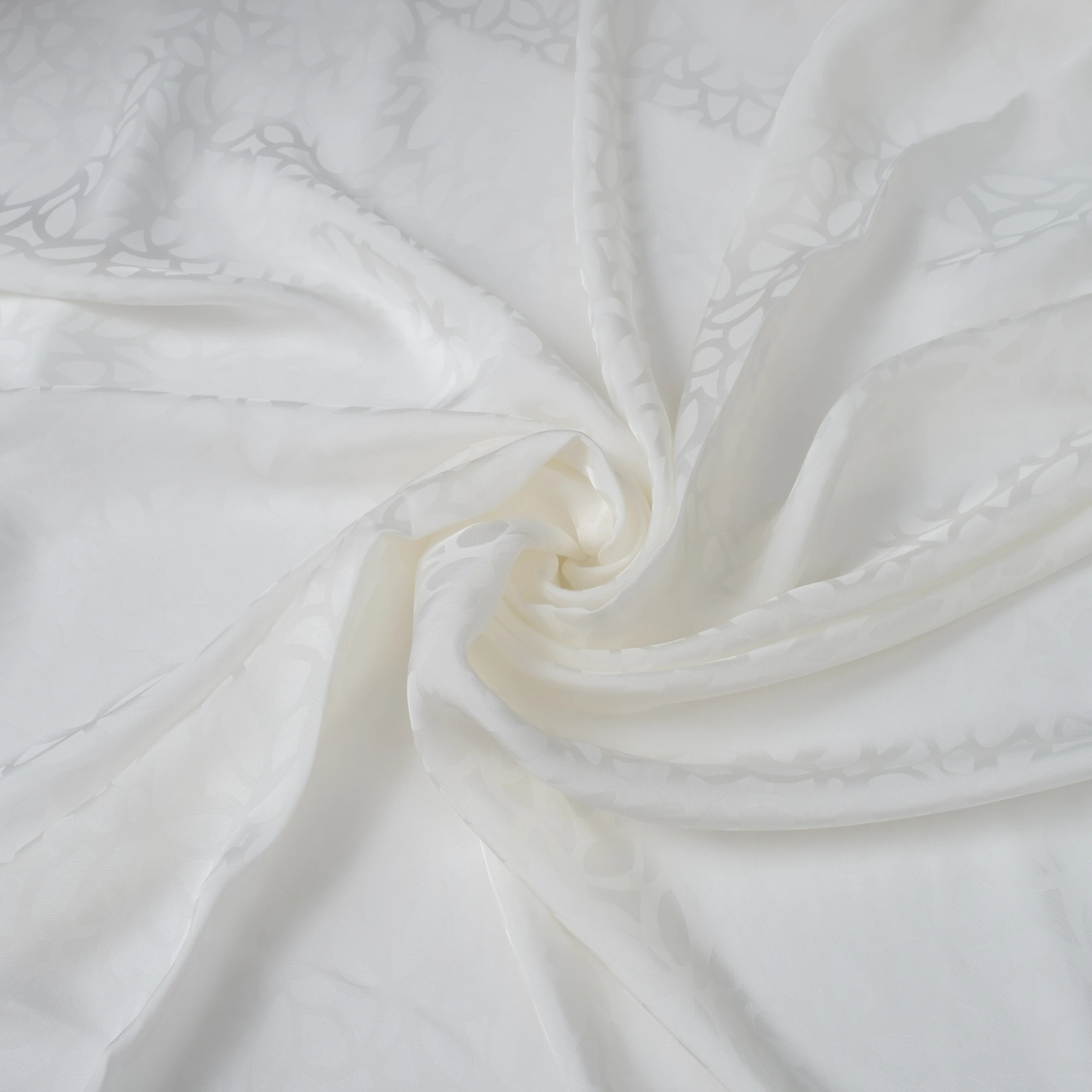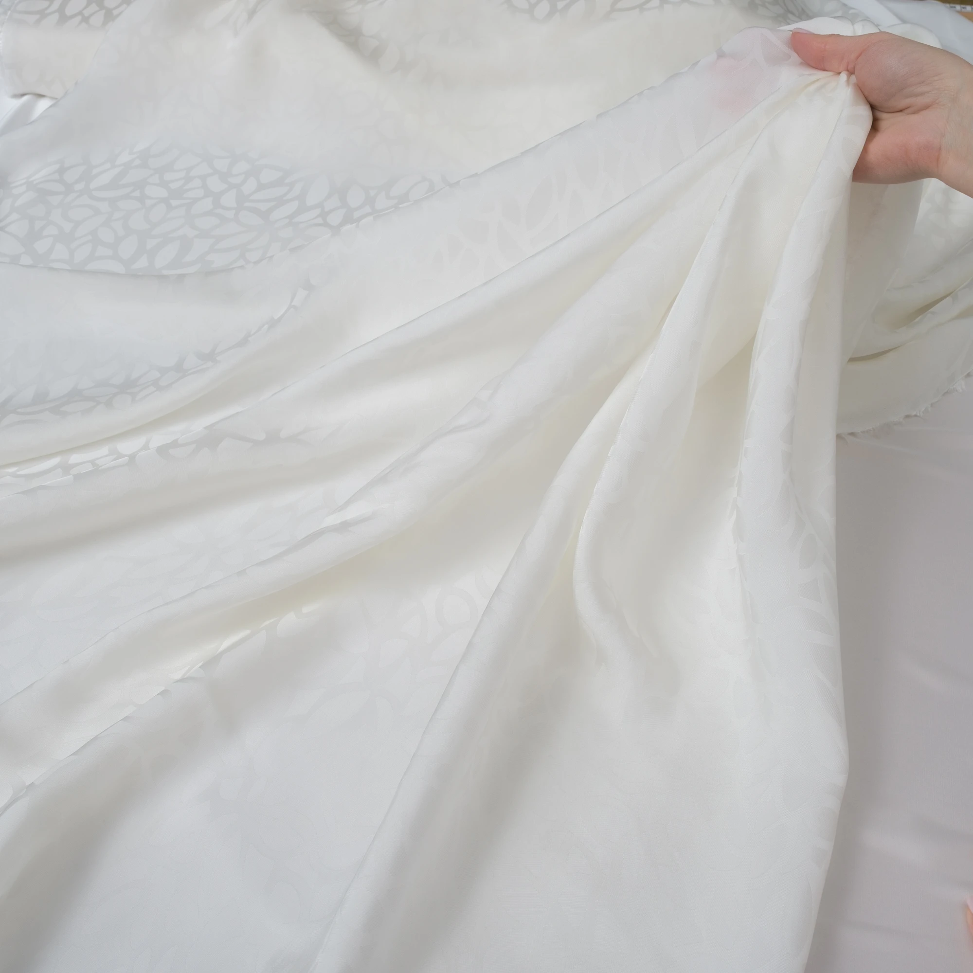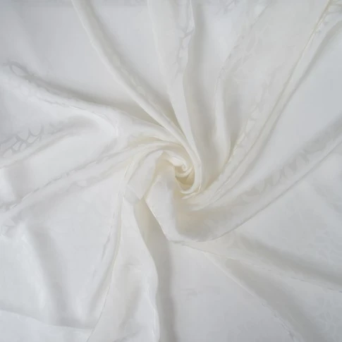 Szlachetna tkanina wiskozowa o żakardowym splocie, utrzymana w delikatnym odcieniu mlecznej bieli. Subtelny, wytłaczany wzór roślinny tworzy elegancką, ton w ton kompozycję, która dodaje materiałowi głębi i wyrafinowanego charakteru, pozostając jednocześnie niezwykle uniwersalna.