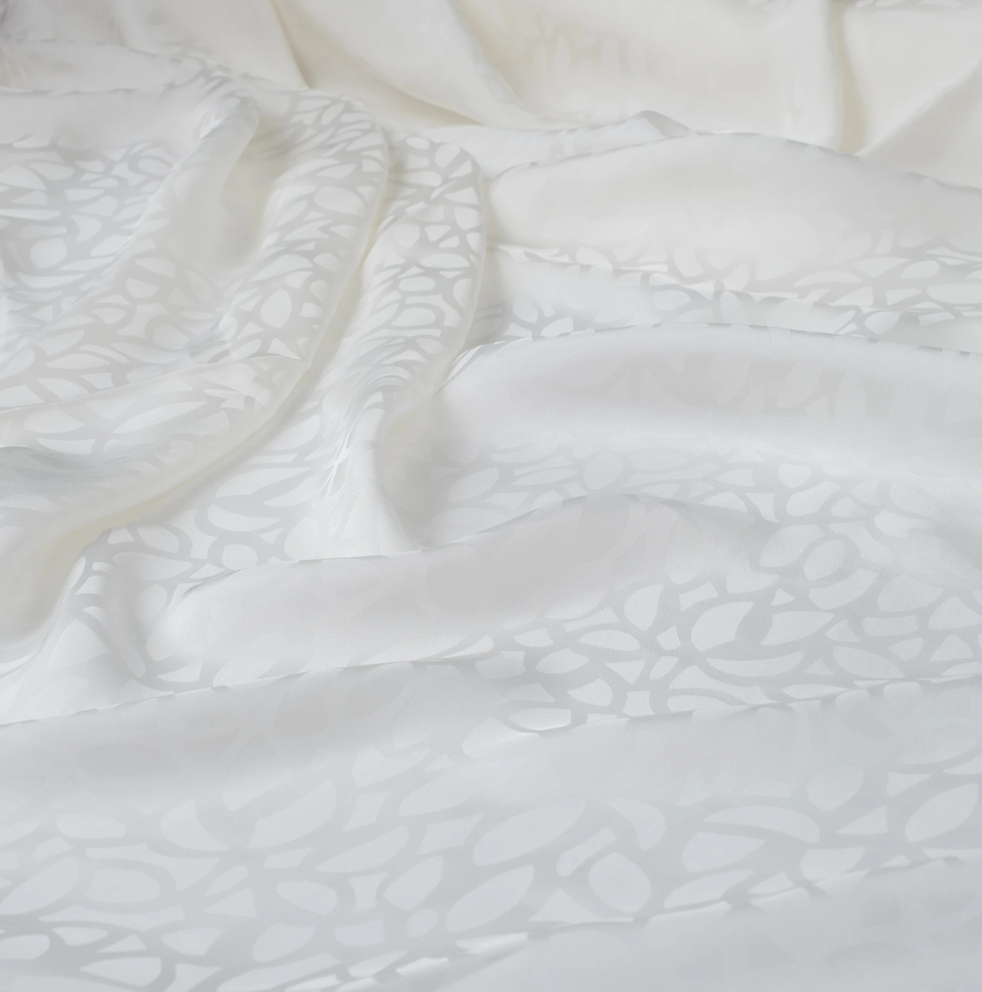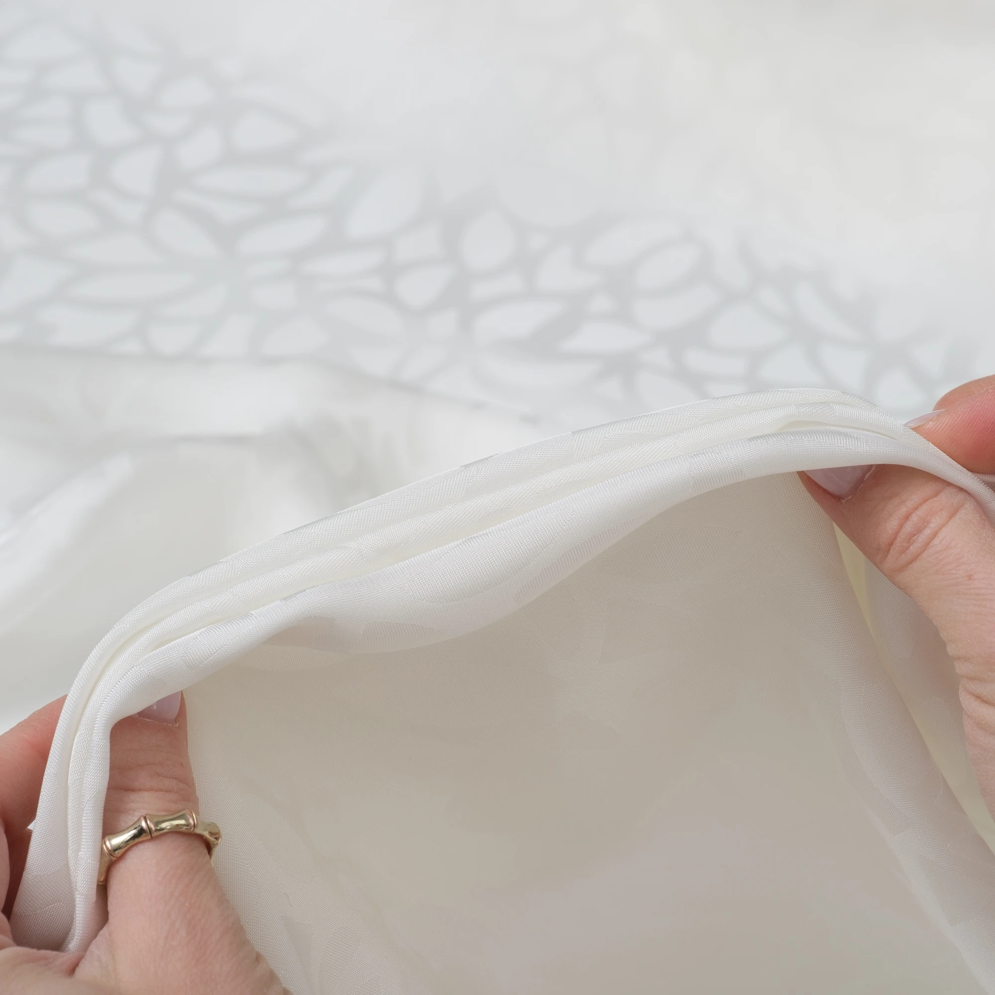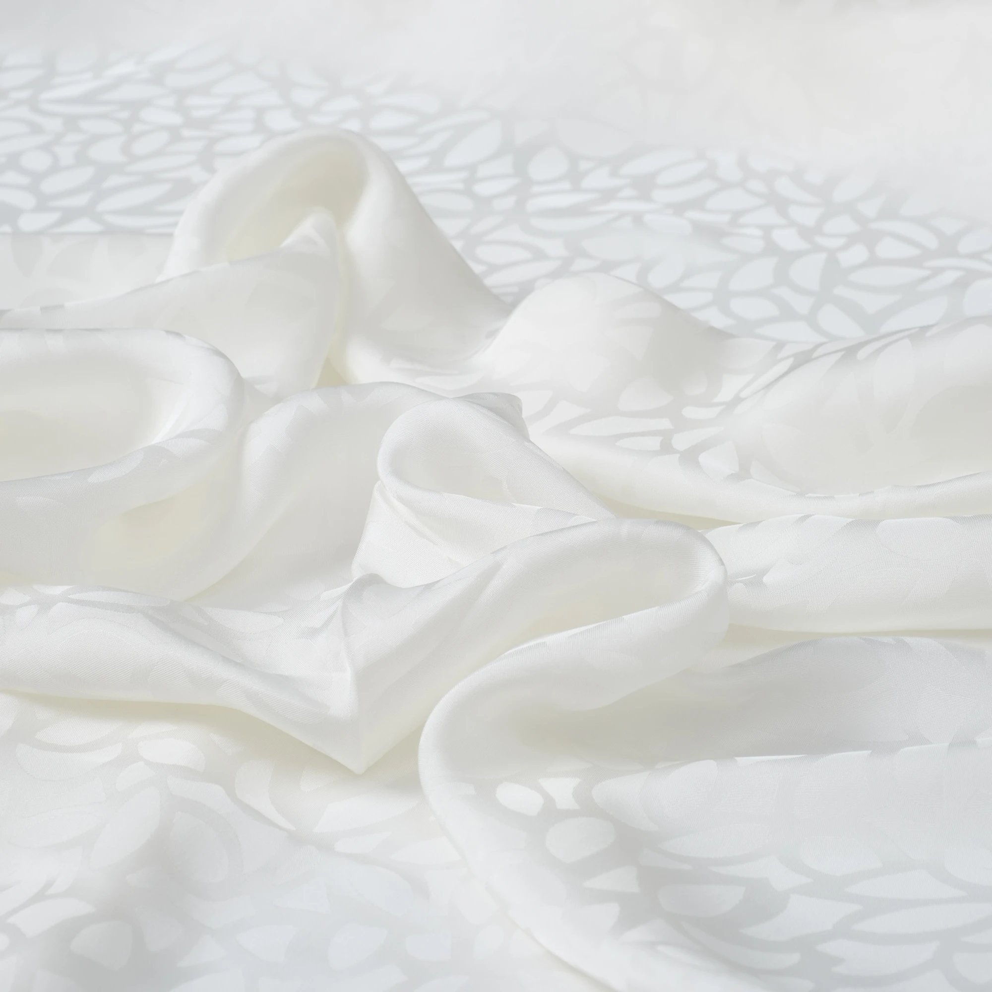Szlachetna tkanina wiskozowa o żakardowym splocie, utrzymana w delikatnym odcieniu mlecznej bieli. Subtelny, wytłaczany wzór roślinny tworzy elegancką, ton w ton kompozycję, która dodaje materiałowi głębi i wyrafinowanego charakteru, pozostając jednocześnie niezwykle uniwersalna.